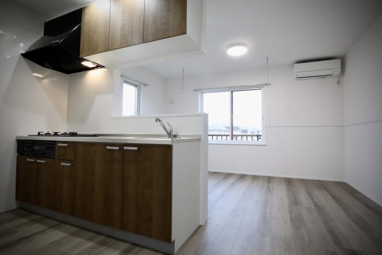 対面式キッチンの後ろには冷蔵庫のスペースを設けました。